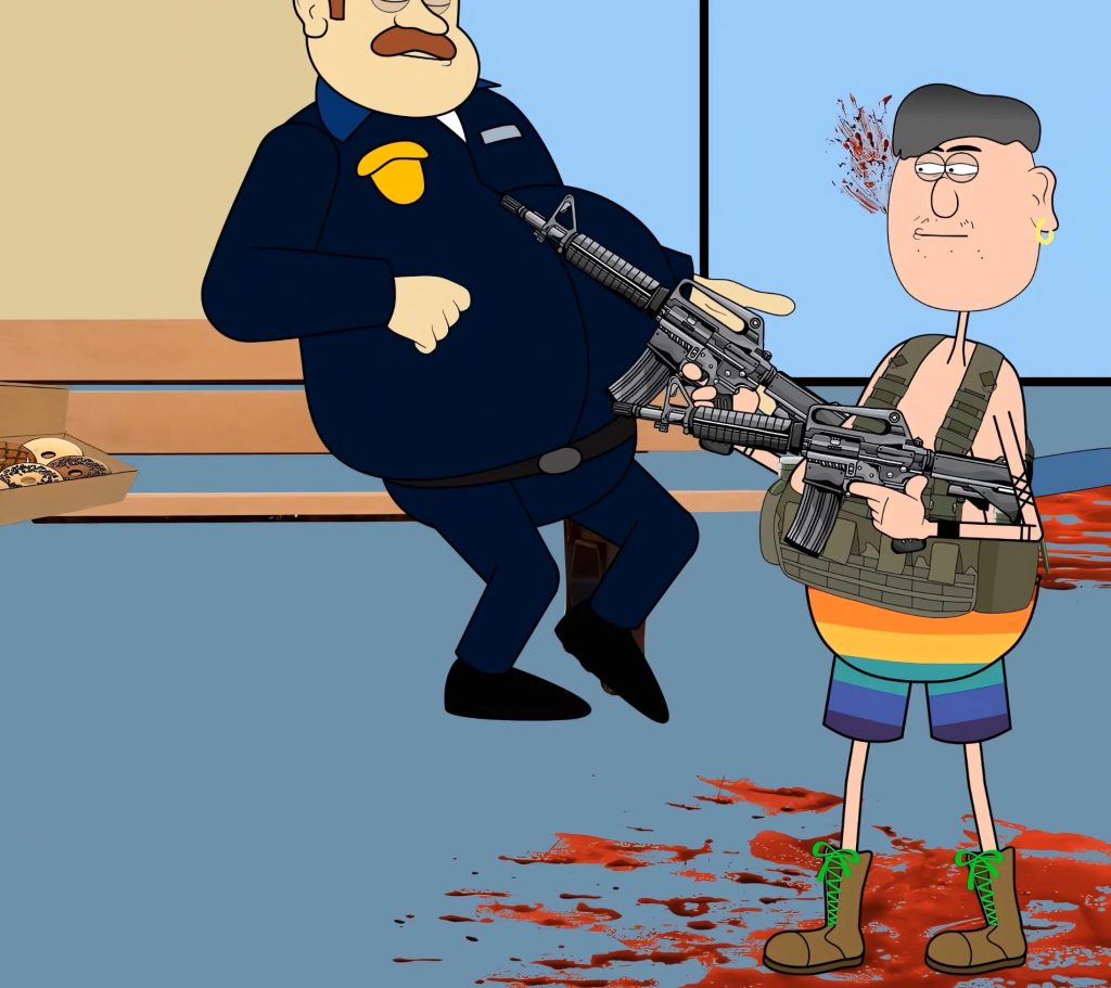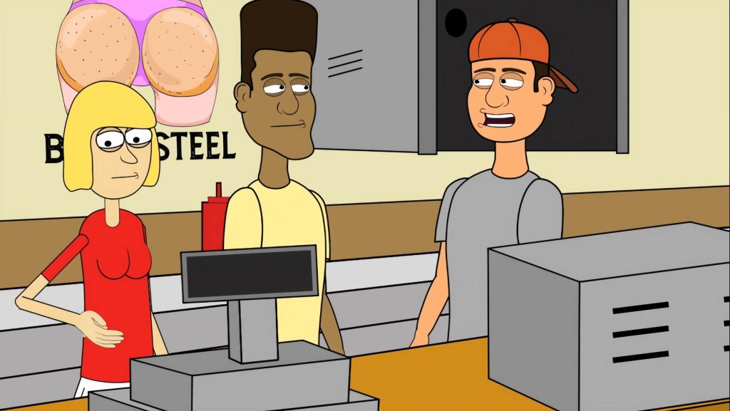 The animation style perfectly matches this tone: deliberately rough around the edges, with bold lines, exaggerated expressions, and a saturated color palette that pops off the screen. While it doesn’t aim for high realism, that works to its advantage, allowing the violence and humor to coexist in a stylized, almost surreal visual world. Some sequences incorporate 3D animation to amp up the intensity, particularly during the explosive opening and slick, stylized end credits.