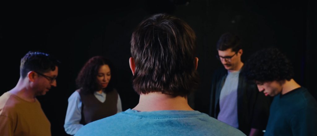 When Remi arrives at the theatre, he finds the group gathered in a circle performing what can only be described as a strange, a cappella rendition of Oh Yeah by Yello — yes, that familiar bass-heavy tune made famous in Ferris Bueller’s Day Off. This opening moment perfectly sets the tone, establishing the group as both enthusiastic and deeply odd.