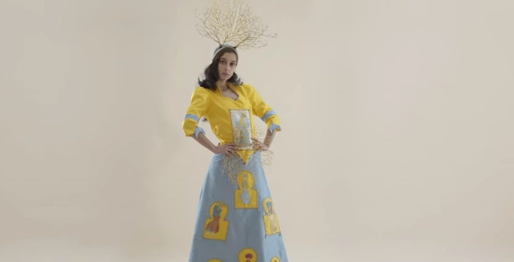 The stars in all of this are of course the designs by Badra, who, using their Berber and Algerian heritage, manages to translate traditional North African fashions into luxurious evening and bridal wear. There are twenty-six different garments on show during the film’s 3 minutes and 41 second run time and each of the designs is bursting with detail. Vivid silks, bejewelled with bright beads and covered with hand-painted images highlighting the themes of women and nature. Vibrant primary colours explode out of the screen, blues, greens, whites, but it is yellow that is the key colour throughout the short, symbolising the sun and life in North African culture. Marcus’ direction gives the whole collection an Andy Warhol and Roy Lichtenstein Pop Art texture.
