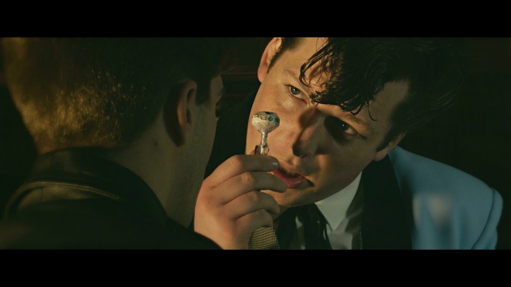 As the film progresses, the aspect ratio shifts to widescreen, accompanied by a more modern film grain, reminiscent of a synthesis between the Tom Hardy starring “Bronson,” a Quentin Tarantino film, and Kubrick’s classic “A Clockwork Orange.” Games skillfully navigates Marty’s crime-ridden existence, marked by clashes with fellow Teddy Boys, altercations with law enforcement, and a formidable showdown with the rival figure, Big Tony (Christian Greenaway).