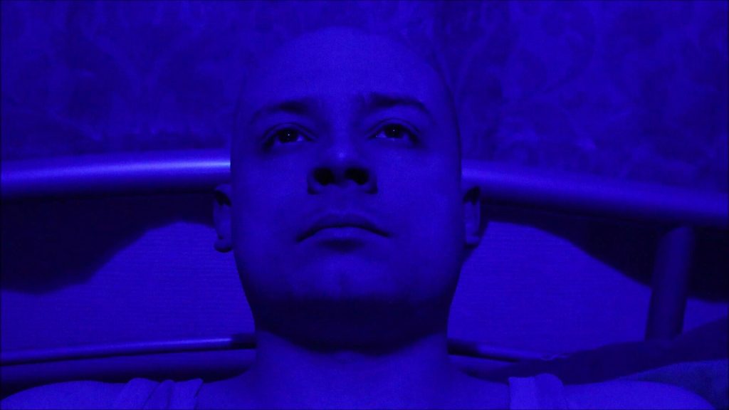 In this micro short, Brocklehurst takes on the role of the lone character, a man featured in two seamlessly intercut scenes. The first scene unfolds with the protagonist in a bath, gently rocking back and forth, while the second depicts him succumbing to suicide by consuming an overdose of pills, his gaze fixed upon a light fixture embedded in the ceiling. The juxtaposition of vibrant colors against the somber subject matter might prove disconcerting for some viewers, yet it undeniably serves as a catalyst for contemplation, prompting a reflective engagement with the film’s thematic depth.